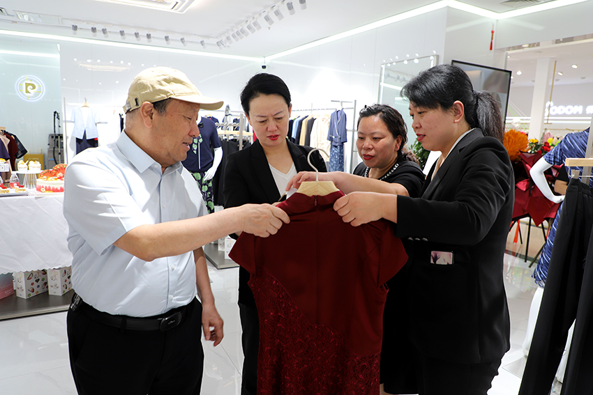 石董事長(cháng)與金威名店總經(jīng)理張燕一起查看女裝商品