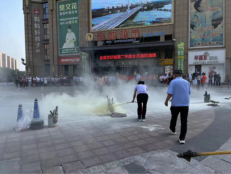 此次消防演練通過(guò)聯(lián)動(dòng)報警、疏散逃生、滅火器實(shí)操、夏季防風(fēng)防汛、案例警示五方面的內容講解、視頻觀(guān)看與實(shí)操演練,切實(shí)強化了全員防災減災意識和應急救援能力。早7:30,一層超市面點(diǎn)加工間油鍋起火,隨著(zhù)賣(mài)場(chǎng)消防警報的拉響,消防演練正式開(kāi)始。通訊小組火速報警,并向上級報告;滅火小組嚴格按照“一三五”原則,奔赴現場(chǎng)進(jìn)行滅火;疏散小組第一時(shí)間組織人員撤離,所有人員捂口鼻、彎腰、靠墻、快速有序逃生至門(mén)前廣場(chǎng);救援小組反應及時(shí),迅速檢查角落、衛生間等隱蔽場(chǎng)所,確保全員安全撤離,無(wú)傷亡發(fā)生。各小組緊密配合、高質(zhì)高效地完成了疏散逃生,得到了社區領(lǐng)導的高度認可。門(mén)前清點(diǎn)人數集合完畢后,由世紀城綜合辦主任李虎講解了不同類(lèi)型滅火器的操作流程,新入職員工及外租商戶(hù)進(jìn)行了實(shí)操,確保了一旦有火情,人人會(huì )撲救的目的。最后,由設備維修部經(jīng)理魏志飛向所有管理人員及值班經(jīng)理詳細講解了夏季防風(fēng)防汛重點(diǎn)部位與處置方法,確保所有人員在面對大風(fēng)、汛期等極端天氣時(shí)能未雨綢繆、沉著(zhù)應對。此次消防演練期間,世紀城各店、各部門(mén)利用晨會(huì )時(shí)間組織全體員工及外租商戶(hù)進(jìn)行了火災視頻觀(guān)看。通過(guò)真實(shí)案例和教訓,讓大家以更強烈的責任意識、更有力的排查舉措、更廣泛的宣傳動(dòng)員,抓嚴抓實(shí)日常隱患排查,樹(shù)牢筑牢全面安全運營(yíng)。